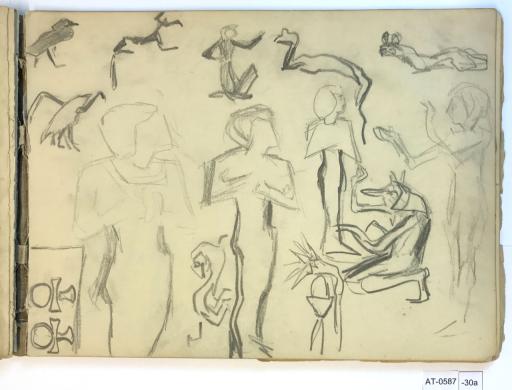 Stiliserte skisser av dyr, fugl og En egyptisk kvinne